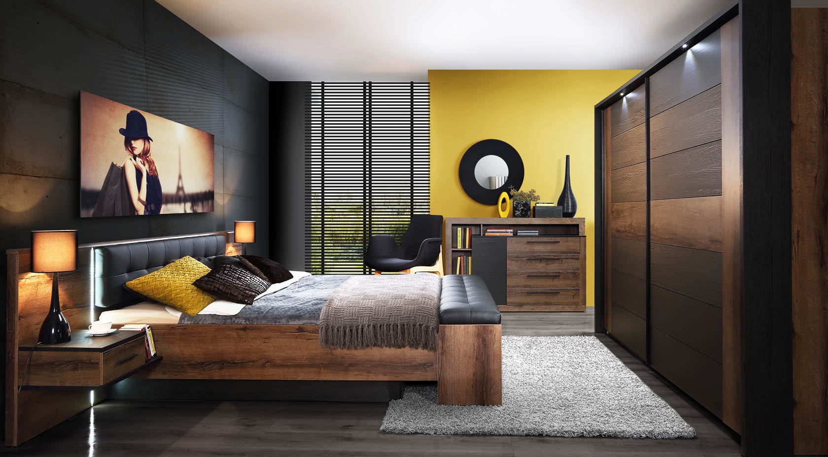 Nastrojowe oświetlenie u wezgłowia łóżka, tapicerowane siedzisko, subtelna gra kontrastów – kolekcja sypialnianych mebli BELLEVUE prezentuje się niezwykle elegancko. Zestawienie ze sobą dwóch odcieni dębu (niech żyje połączenie Dębu Szlachetnego z Dębem Czarnym!), sprawia, że klasyka spotyka się tu ze swego rodzaju nieszablonowością. BELLEVUE narzuca nam kolejne aranżacyjne decyzje, tworząc wnętrze o danym klimacie i stając się wyróżnikiem naszego domu. Uwagę przykuwa także niecodzienny projekt poszczególnych mebli, komody połączonej z półką na książki oraz niebanalnych stolików nocnych.