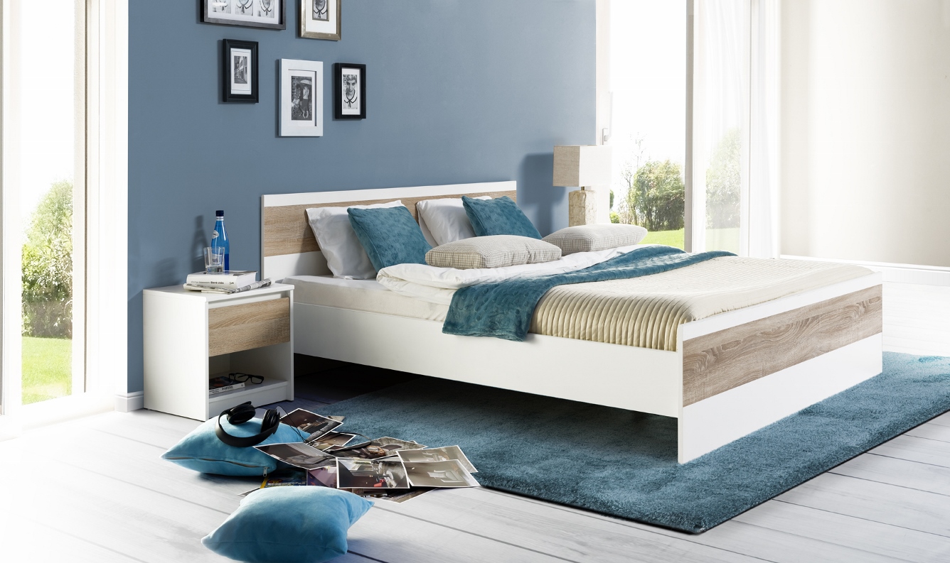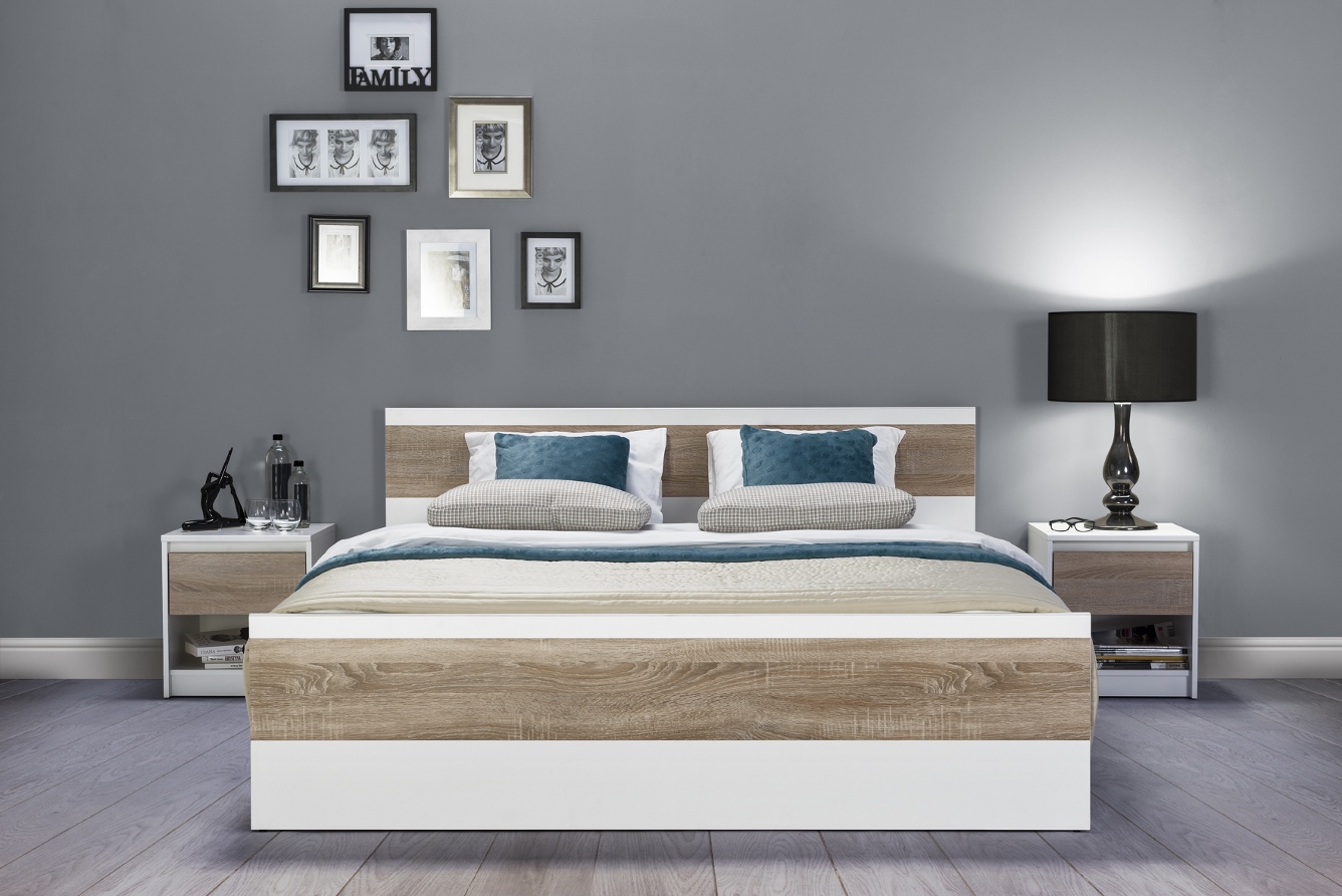 Nowoczesna sypialnia, stworzona z minimalistycznych brył charakteryzujących się prostą formą. Elementem wyróżniającym mebel jest połączenie bieli z dębem sonoma. Brak uchwytów powoduje, że bryły nabierają jeszcze bardziej minimalistycznego wizerunku. Biel jest kolorem, który doskonale łączy się z innymi barwami, dzięki temu system ten sprawdzi się w wielu wnętrzach i aranżacjach.